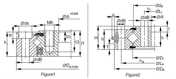 XU 系列机器人专用交叉滚子轴承为无齿结构,内圈和外圈均设有安装孔,安装孔可选用沉头孔或螺纹孔。外圈外径上可配置润滑嘴,轴承两侧均装配橡胶密封圈。该系列轴承的内径范围为 Φ40~Φ976mm。