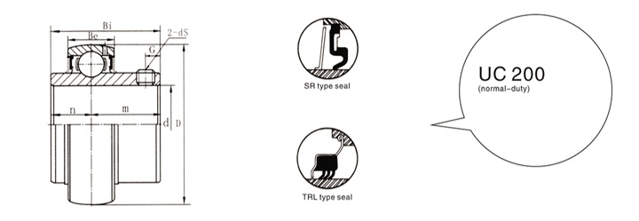 带顶丝的外球面球轴承包含 UC200 系列(轻型系列)、UC300 系列(重型系列) 及其变型产品 SB(UB)200 系列。