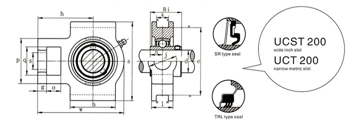 UCT300 系列的承载能力优于 UCT200 系列。此类外球面带座轴承多用于皮带、链条等传动装置的传动轴上。